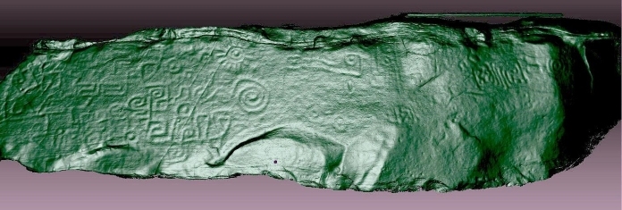 The monolith of Pukarumi reborn in 3D: the green render was chosen for ease of distinguishing the petroglyphs