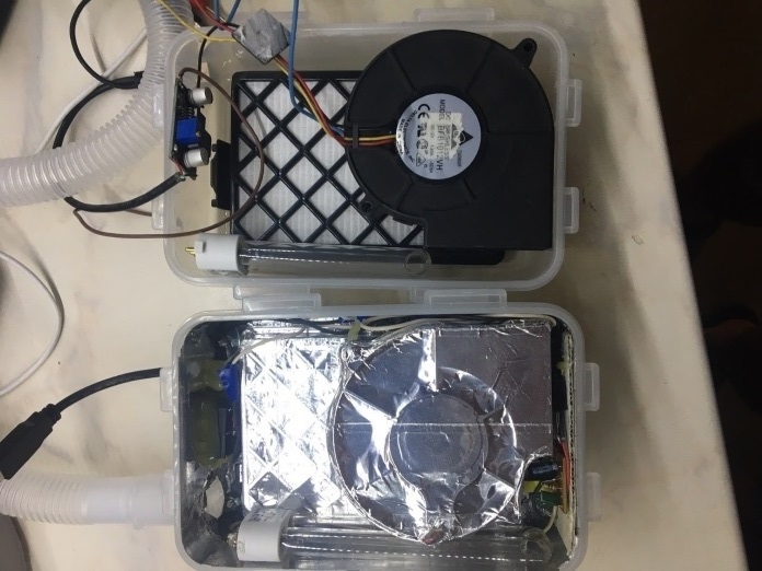 Placé dans une boîte à tartines en plastique, le cœur du système consiste en un filtre d’aspirateur, une lampe à rayons UV pour tuer les virus et les bactéries, et un ventilateur d’ordinateur pour souffler l’air purifié vers le porteur. La source d’alimentation de ce dispositif est une batterie rechargeable intégrée et son chargeur.